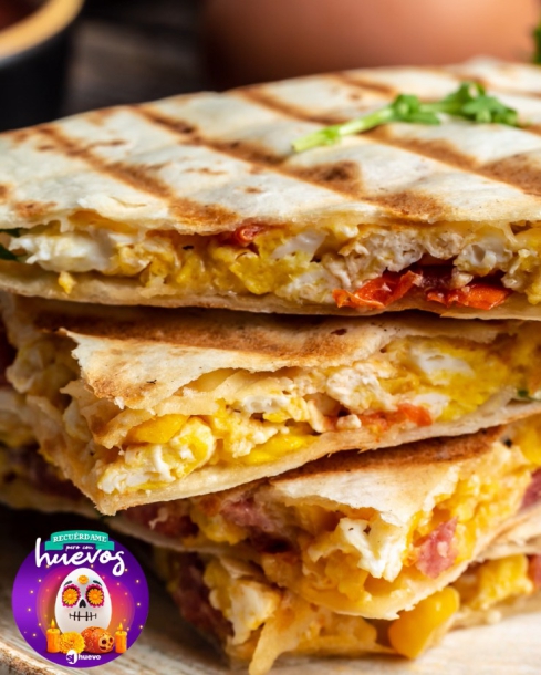 3. Sobre la tortilla abierta, en el medio, coloca la mezcla de huevo y las rodajas de queso restantes, y cierra la tortilla.